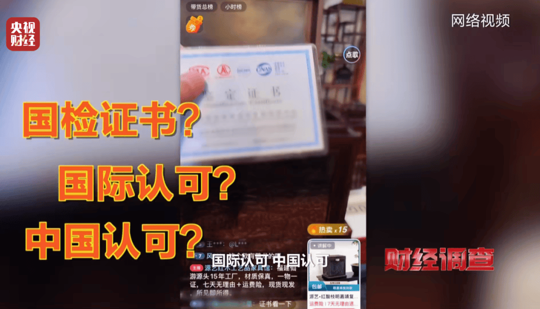 离开该鉴定机构,记者上网搜索个别电商红木工艺品直播间,就看到了这些“国检”证书。主播喊“帝王之木”“寸檀寸金”,标榜“国家机构检测”“买假包赔”,将0.8元的假证书吹成 “定心丸”。