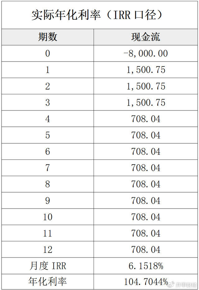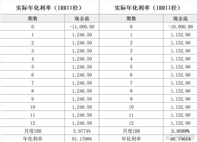 那么,上述两个案例中,稳融花的实际年化利率到底是多少?开甲财经计算后发现,按照IRR计算,第一个案例中,借款本金11000元,12个月总还款额14958元,总利息为3958元。表面上看,平台借款单利为3958/11000=36%。但是,贷款本质上是一个现金流问题,借款人每月还本付息,因此应当按内部收益率(IRR)计算真实利率。