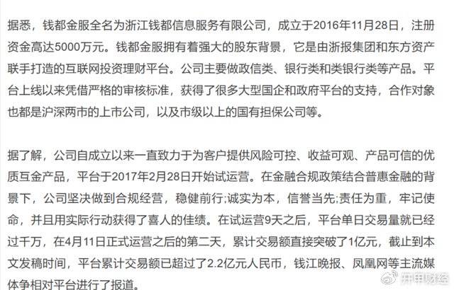 据媒体报道,上线一年多以后,2018年11月,因为国资企业舟山水产品中心批发市场有限责任公司到期未兑付9999万元承兑汇票,“钱都金服”旗下产品出现逾期。
