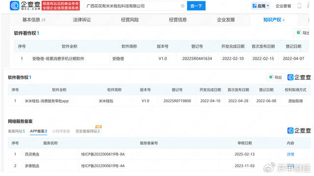 广西云腾智创的实际控制人陈素远名下共有5家关联公司,包括南宁小苔网络科技有限公司、广西花花有米米钱包科技有限公司、南宁亿升科技有限公司等,其中,他控制的广西花花有米米钱包科技有限公司注册有场景消费分期产品“安稳借”;南宁小苔网络科技有限公司注册了米米钱包APP,并备案了百灵美选 、多惠甄选两个APP。