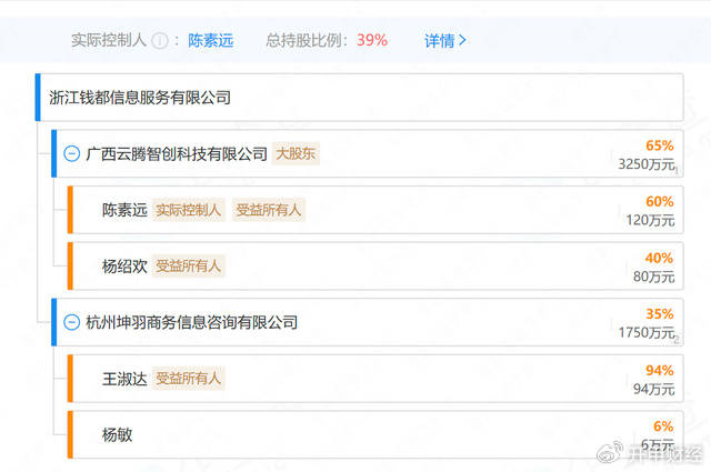 企查查显示,广西云腾智创持有浙江钱都信息服务有限公司65%的股份。浙江钱都信息服务有限公司的前身是P2P平台钱都金服,公司成立于2016年11月,注册资本5000万元,法人为蒋真悦。钱都金服曾经背景显赫,昔日控股股东杭州云蝶加速投资管理合伙企业持股35%,浙报传媒控股集团持股30%,浙江融达企业管理有限公司持股20%,浙江文创小额贷款股份有限公司持股15%。值得注意的是,浙报集团通过浙报传媒控股集团和浙江文创小额贷款股份有限公司合计持股34.5%。
