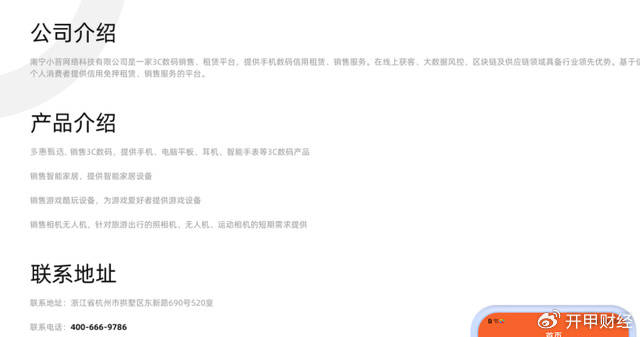 南宁小苔网络官网显示,其是一家3C数码销售、租赁平台,奇怪的是,虽然公司注册在广西,但公司实际办公地址在杭州拱墅区东新路690号520室。