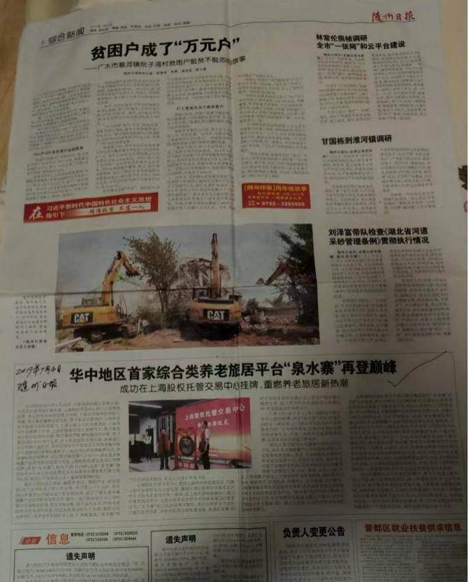 其中,《随州日报》2019年7月4日的报道《华中地区首家综合类养老旅居平台“泉水寨”再登巅峰》称,湖北泉水寨公司2019年6月25日在上海股权托管交易中心鸣锣挂牌。时任大悟县政协副主席、民政局局长等官员出席仪式。
