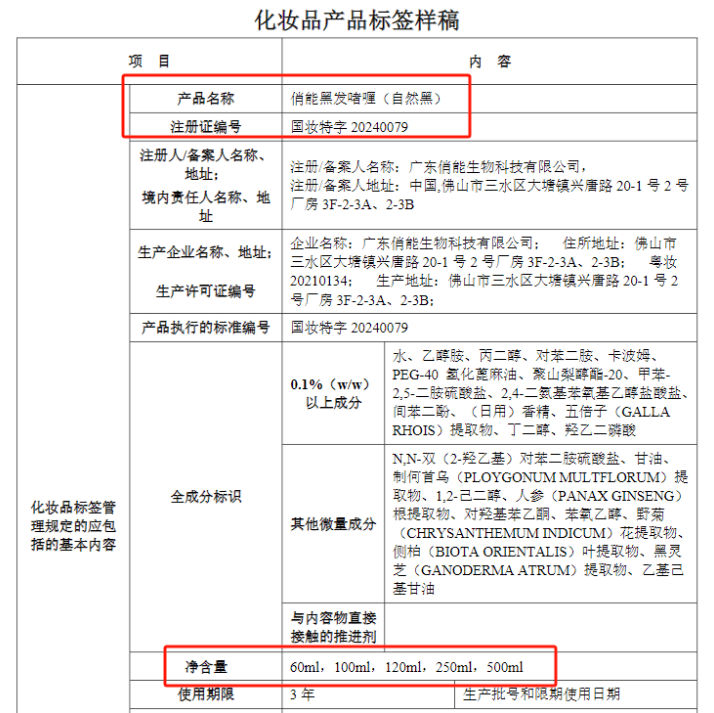 用户购买的产品外包装标注规格与药监局备案信息严重不符,批件号对应的实际是广东俏能生物科技的"俏能染发膏3.0"。这种"套证"行为在京东、抖音等平台普遍存在,侗染旗舰店多款产品均存在淡化真实品名、突出自有品牌的情况。