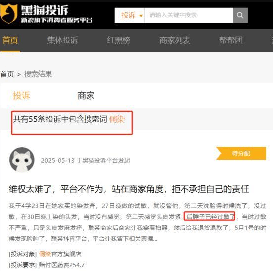 黑猫投诉平台显示,侗染产品因过敏、上色差、掉色等问题累计投诉超千条。其产品实际成分中仍含有对苯二胺等致敏物质,却在宣传中刻意规避风险提示,违反《化妆品监督管理条例》关于安全警示的规定。