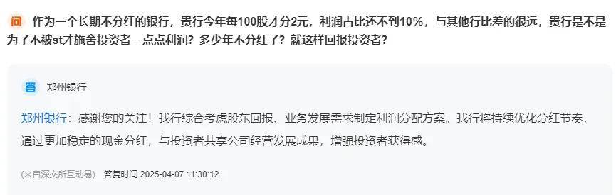 时隔四年重启分红,郑州银行却创下两项尴尬纪录:1.82亿元的分红总额在A股上市银行中垫底,9.69%的分红比例更是唯一低于10%的银行。有投资者在互动平台直言不讳:“每100股分红2元,连银行活期利息都不如,这是为规避ST规则而应付了事!”面对投资者的强烈质疑,该行仅以“平衡股东回报与发展需求”的官方说辞回应,未给出任何实质性承诺。