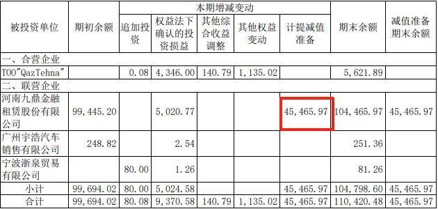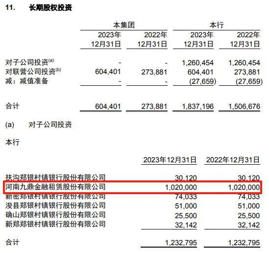 蹊跷的是,作为九鼎金租的控股股东,郑州银行对同一标的却采取了截然不同的处理方式。年报数据清晰显示,郑州银行对九鼎金租的长期股权投资金额显著高于宇通客车,然而2023年至2024年连续两个会计年度,均未计提任何减值准备。