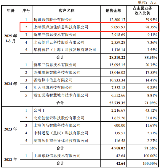 2025年一季度,第二大客户上海源庐加佳信息科技有限公司突然现身。调查发现,该公司在2024年8月以6000万元取得沐曦股份4.75万股股份,持股比例0.55%。入股仅数月后,便一跃成为公司第二大客户,此前从未进入前五大客户名单。