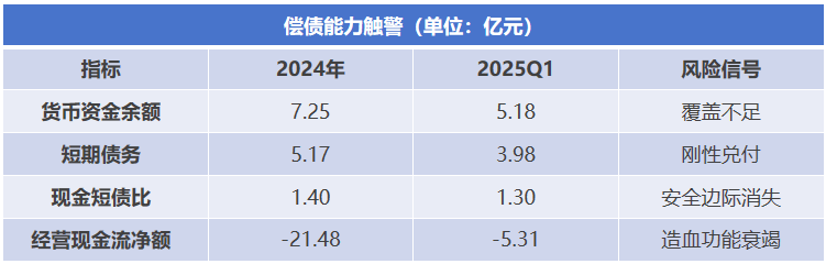 瞭望塔财经提醒投资者注意的是,当2025年一季度经营现金流仍净流出5.31亿元,账面现金仅剩5.18亿元,如何应对3.98亿元即将到期的短期债务?若IPO募资失败,公司是否面临资金链断裂风险?