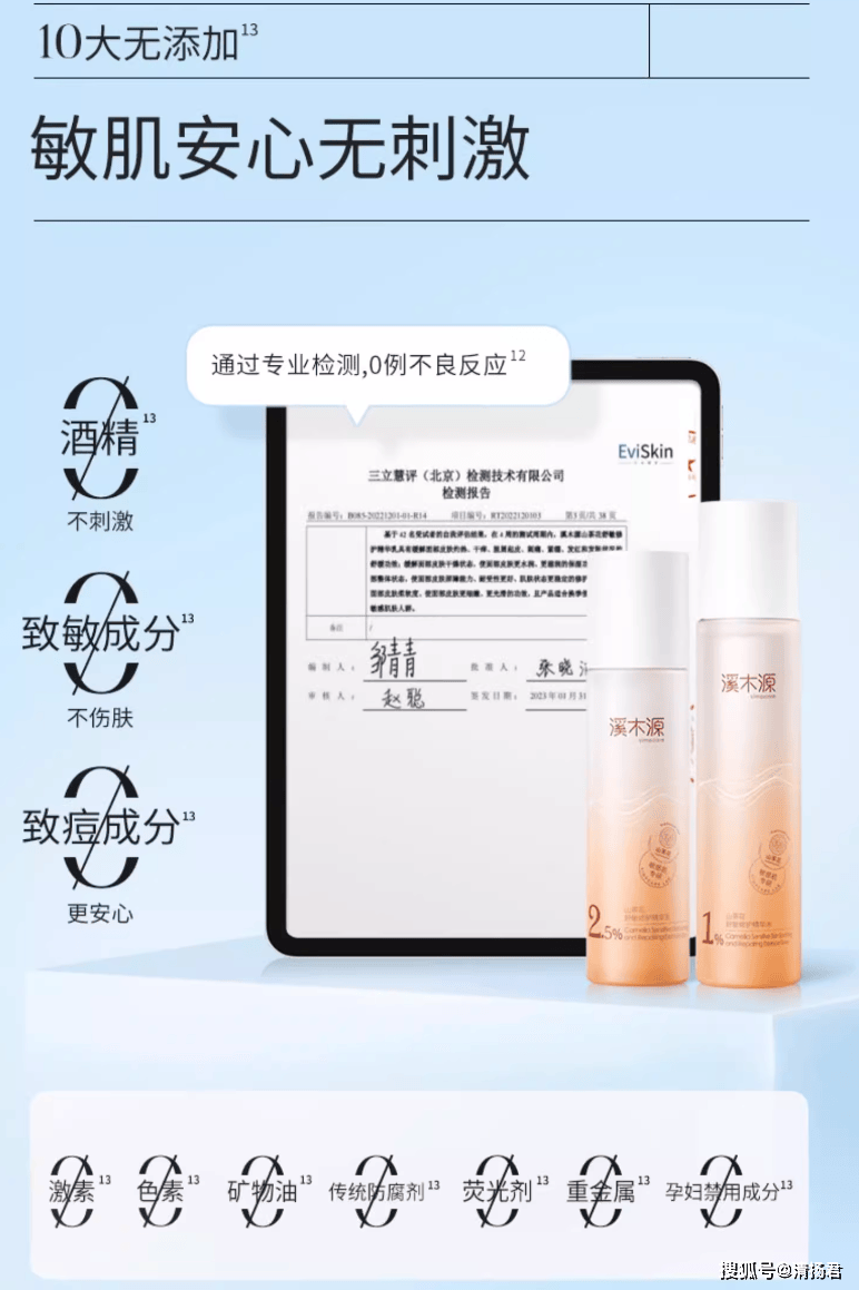 反观化妆品行业,“0添加”概念仍在野蛮生长。溪木源作为敏感肌护理领域的头部品牌,其大量产品宣传中随处可见“0酒精、0致敏成分”等表述。