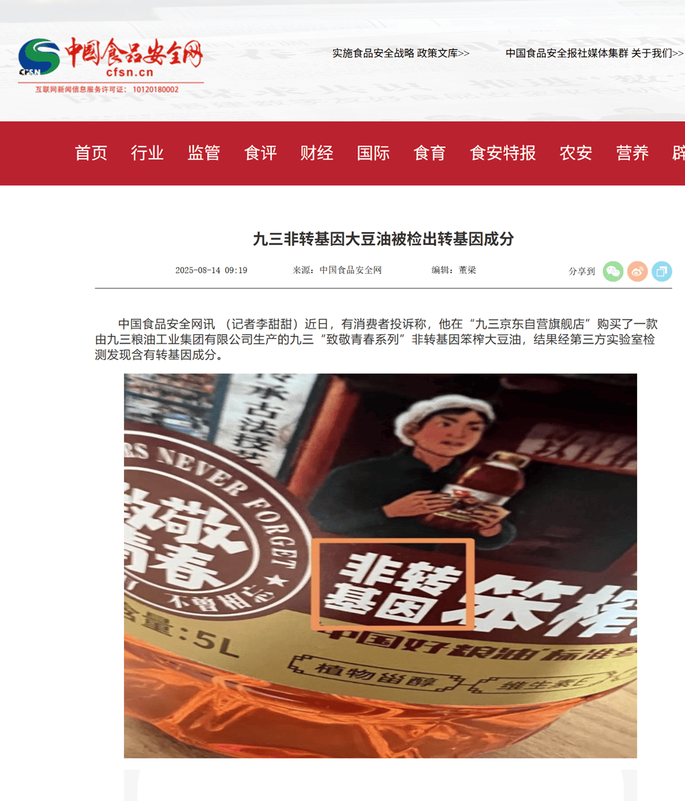 九三非转基因大豆油被曝检出转基因成分:企业品控遭质疑