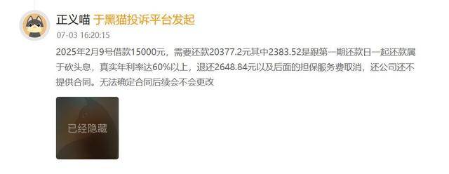 有借款用户在黑猫投诉上表示,借一万本金要还一万六,综合年利率达到60%。还有借款用户表示,今年2月9号借款15000元,需要还款20377.2元,其中2383.52元是跟第一期还款日一起还款,质疑其属于“砍头息”,真实年利率达60%以上。