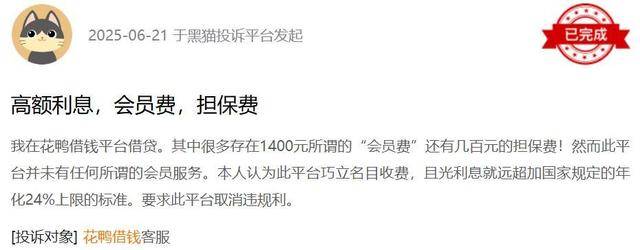 另有用户在黑猫投诉上称,2024年8月16日在花鸭平台贷款3000元,分12期还,每月还339.75元,一共担保费460元,利息617元。