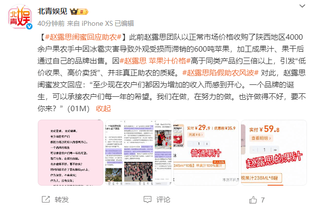 赵露思陷“假助农”风波:带货苹果汁被指价格是同类产品3倍