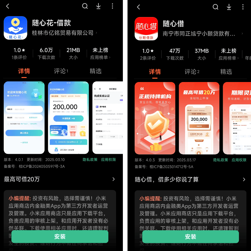 发稿前,《读懂数字财经》在华为应用市场、应用宝等应用市场检索发现,随心借相关产品已经下架,但小米应用市场依然可以下载安装随心借、随心花等产品。这一现象显示,小米应用商店对该类产品的上架标准或与其他平台存在差异。