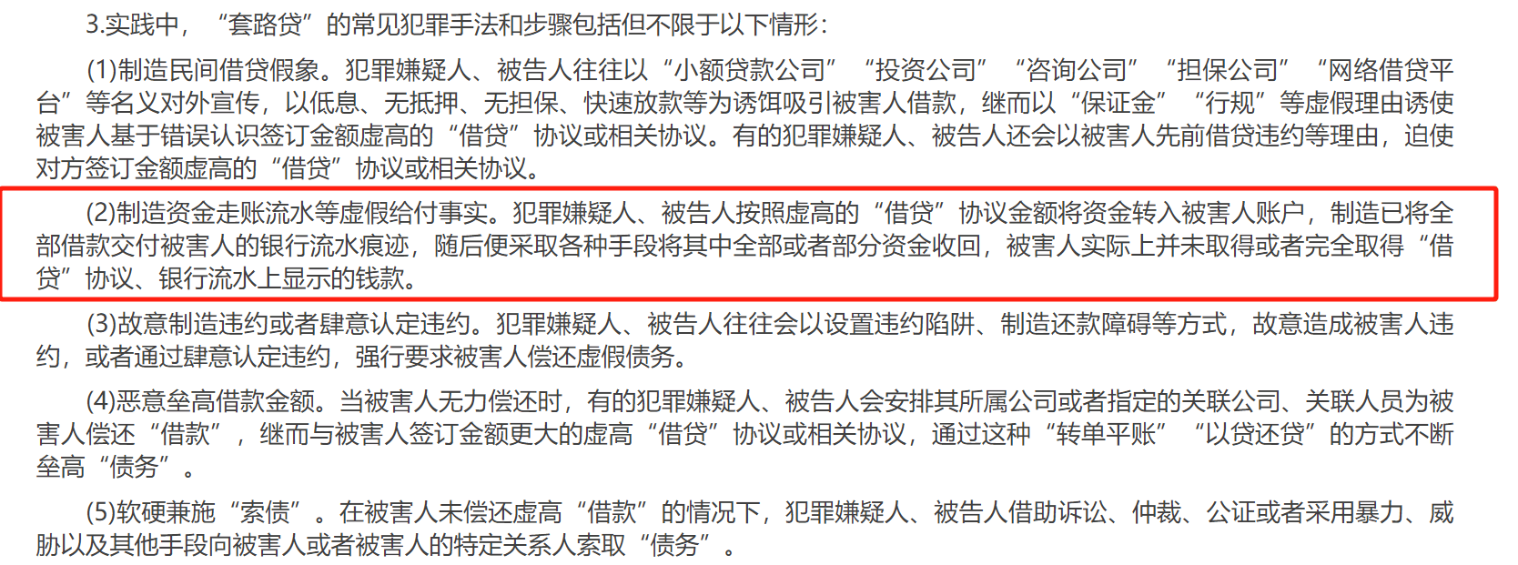 2019年发布的《关于办理“套路贷”刑事案件若干问题的意见》指出:实践中,“套路贷”的常见犯罪手法和步骤包括但不限于以下情形:制造资金走账流水等虚假给付事实。犯罪嫌疑人、被告人按照虚高的“借贷”协议金额将资金转入被害人账户,制造已将全部借款交付被害人的银行流水痕迹,随后便采取各种手段将其中全部或者部分资金收回,被害人实际上并未取得或者完全取得“借贷”协议、银行流水上显示的钱款。