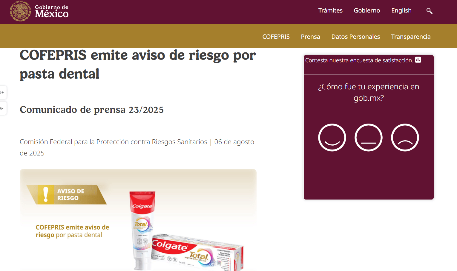 南都湾财社记者注意到,高露洁墨西哥官网刊登了对此事的回应声明。高露洁棕榄公司表示,根据墨西哥联邦健康风险防护委员会的规定,企业将在墨西哥销售点召回该款牙膏。