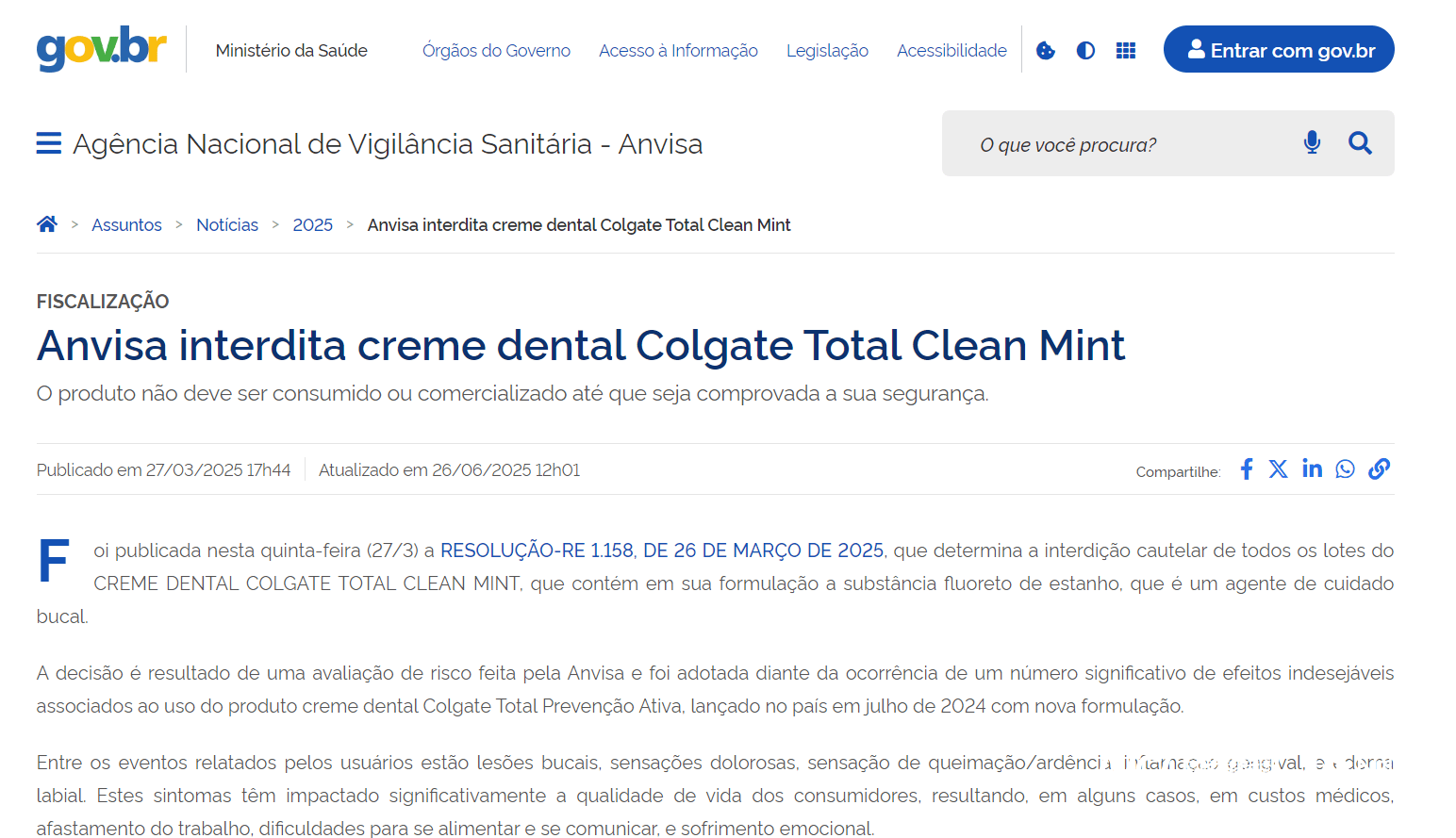 巴西政府部门在公告中指出,消费者出现不适症状或与牙膏中添加的氟化亚锡有关,但巴西国家卫生监督局也指出该物质具有抗菌和防蛀的功效。