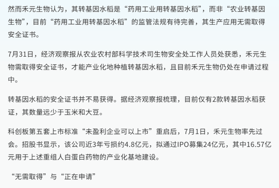 然而,产品能否大规模投产,除了药监审批,还要跨过另一道关口——农业农村部的安全证书。《经济观察报》近期披露了一个关键分歧:禾元生物在公开说明中称,其所使用的“药用工业用转基因水稻”不同于粮食作物,不属于农业转基因生物管理范围,因此无需申请农业部的安全证书(来源:《经济观察报》,2025年8月8日)。