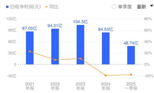 业绩数据显示,2024年伊利股份销售额达1158亿元,但同比下滑8.24%,创下近年来首次负增长记录。盈利表现同样承压,继2023年归母净利润突破百亿后,2024年骤降至84.53亿元,同比大幅缩水18.94%。进入2025年,业绩颓势未见好转,一季度净利润同比继续下跌17.71%。