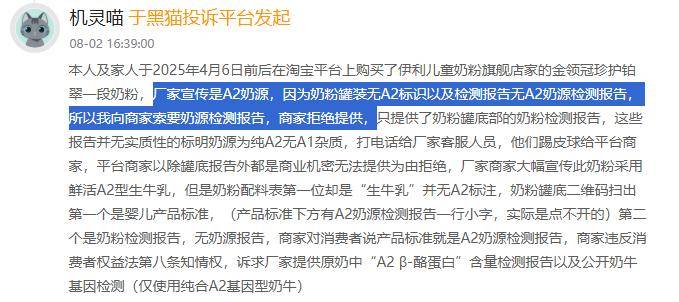 另有消费者对金领冠奶粉的“A2奶源”宣传提出质疑,其曾于2025年4月在淘宝伊利官方旗舰店购买金领冠珍护铂翠一段奶粉,此后其发现,产品奶粉罐装包装未标注“A2”标识,且商家未能提供针对A2奶源的相关检测报告。