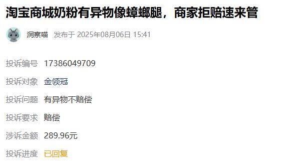 8月6日,一名消费者通过黑猫投诉平台反映称,其在某电商平台购买的金领冠奶粉中发现疑似蟑螂腿的异物,涉及金额289.96元。消费者表示与商家协商赔偿未果后,遂向平台发起投诉。流程信息显示,品牌方接到投诉后回应称,已收到消费者反馈,并将安排专人跟进处理该问题。