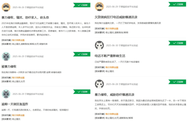 然而这种“高效处置”,换来的是海尔消金暴力催收的投诉量居高不下。