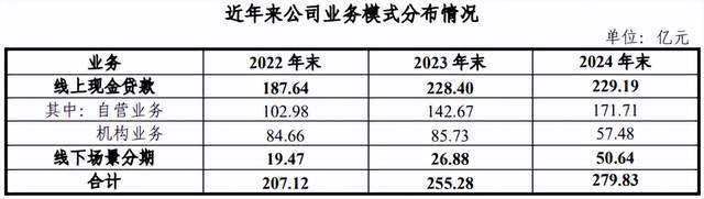 从业务结构来看,虽然是产融类的消金公司,早期专注于家电分期业务,但最近几年现金贷业务已成为公司的主要收入来源,截至2024年末现金贷业务规模222.19亿元,占比81.9%,而2022年末现金贷业务占比曾超过90%。