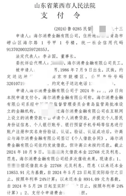 海尔消金起诉之后还会申请“支付令”,借款者如果15天内不理会,支付令落实,起诉方可以向法院申请强制执行。如果借款者对支付令有异议,可以提供书面的异议申请并邮寄至受理的法院。