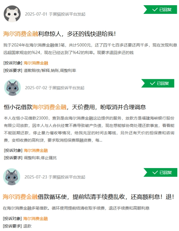 还有消费者称,2024年在海尔消金借款3笔共5000元,还了4700多元,还要还2000多元,利率已超过国家规定的24%上限。