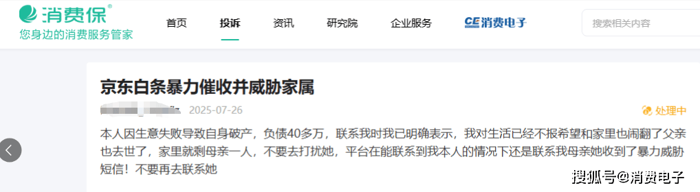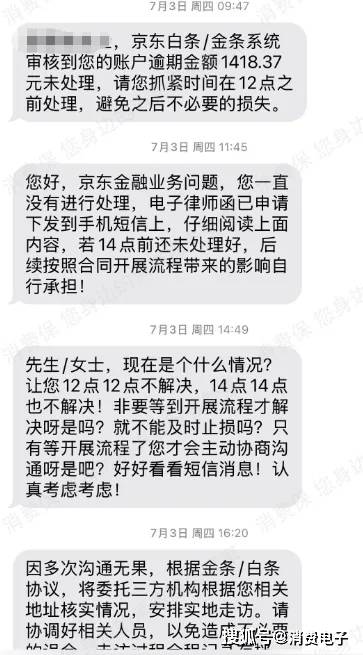 “我在京东金融一共借了13000,目前还剩10000多。由于毕业生压力大,找不到合适工作就逾期了。”投诉人杨先生(化名)在申诉中写道,催收人员“就开始暴力催收,服务态度差,短信恐吓”,“骚扰家里亲戚朋友”。