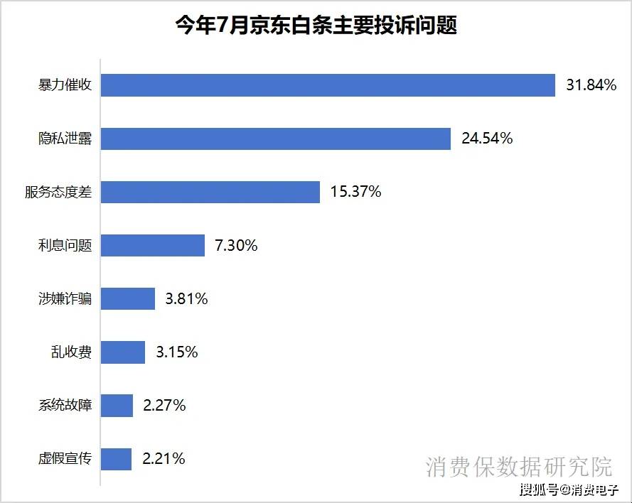 据“消费保”平台统计,2025年7月,京东白条的投诉主要集中在暴力催收、隐私泄露、服务态度差、高额利息等多个方面。其中,关于暴力催收的投诉高达31.84%,位居所有问题之首;隐私泄露和服务态度差则紧随其后,投诉占比分别达到24.54%%和15.37%——这是用户反映最为集中的三大痛点。