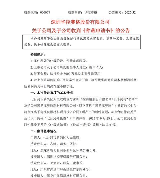 一场耗时四年的锂电项目烂尾,让深圳A股上市公司华控赛格(000068.SZ)与黑龙江省七台河市新兴区人民政府陷入互诉仲裁的拉锯战。双方各执一词,案件走向扑朔迷离。