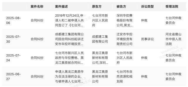 6月25日,华控赛格及子公司黑龙江奥原新材料有限公司收到七台河仲裁委员会的《仲裁通知书》及相关法律文书,6月27日首次披露仲裁情况,正式宣告案件进入仲裁程序。