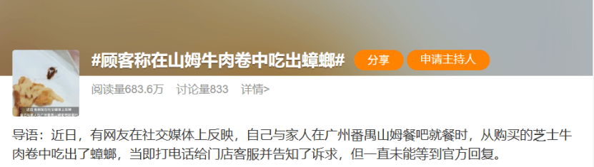 8月4日,顾客在广州番禺山姆餐吧就餐时,意外从芝士牛肉卷中发现一只蟑螂。据当事人描述,发现问题后立即拍照取证,并多次致电门店客服和上传证据,但10小时内仅得到"已加急处理"的重复回复,未获实质性解决方案。