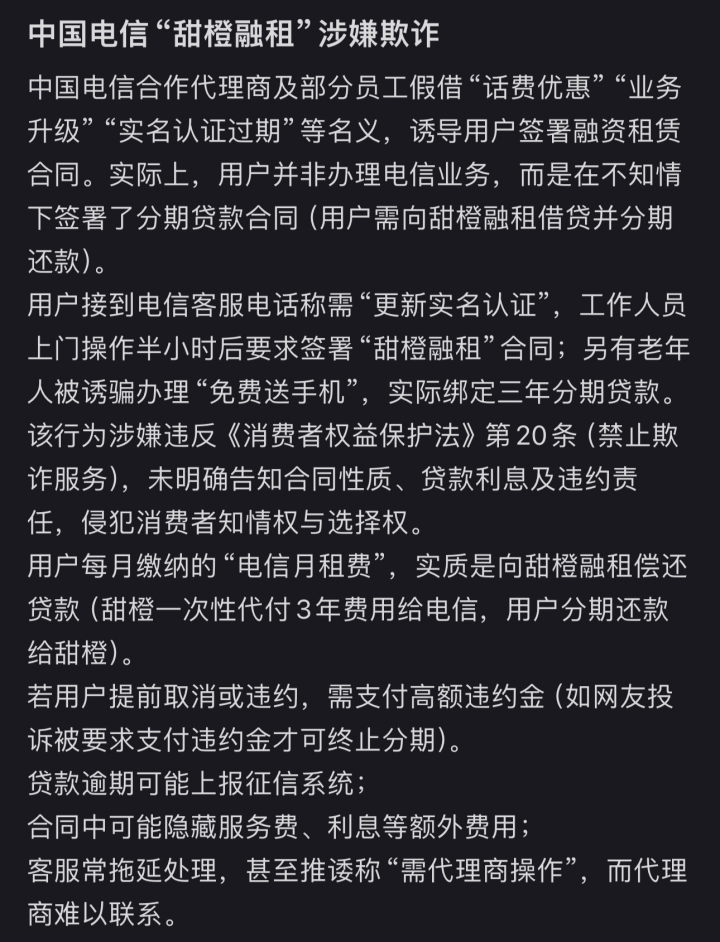 杨女士表示,签字后立刻警觉查询,惊悉“甜橙融租”实为中国电信旗下金融产品。原本正常的每月话费缴纳,竟被转换为用户向“甜橙”贷款支付三年总额,再分期偿还的模式。杨女士认为,中国电信以“实名认证”为幌子,诱导用户在不知情下签署金融贷款合同。