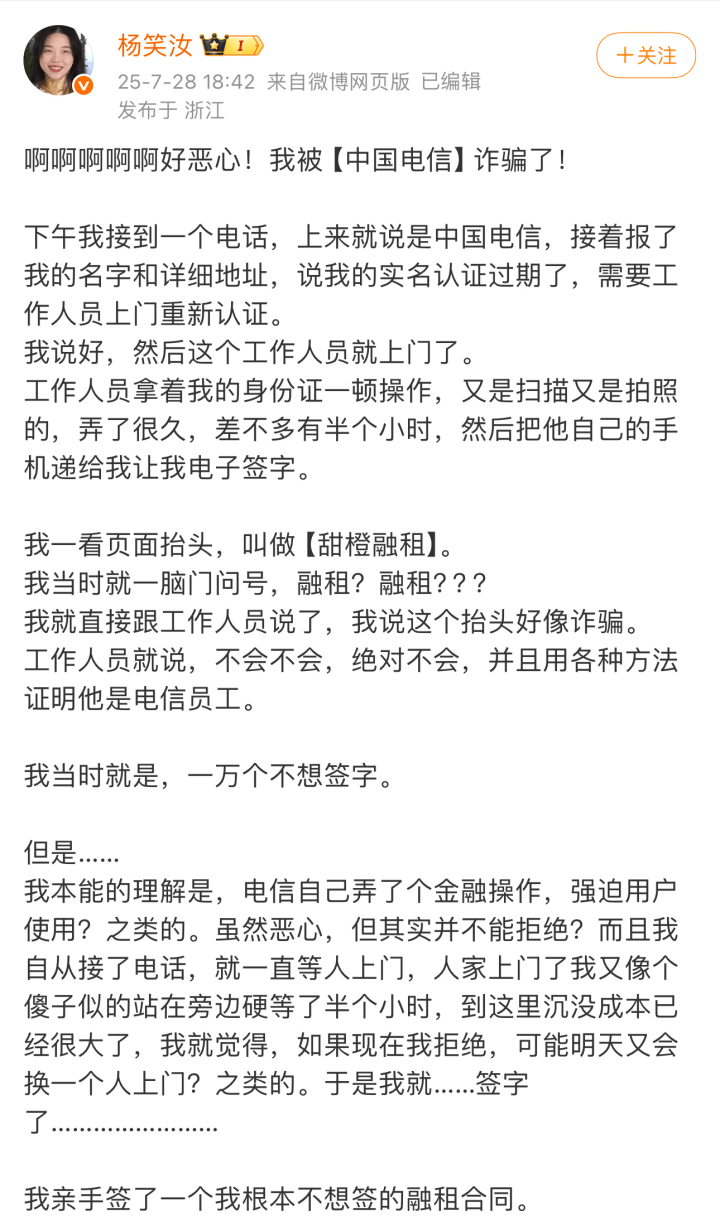 据蓝鲸新闻消息,7月28日,博主杨笑汝发文称,接到自称中国电信的来电,声称其“实名认证过期需上门重新认证”。在工作人员上门后,杨女士在经历了长达半小时的身份证扫描与拍照流程后,最终被要求在抬头为“甜橙融租”的电子页面上签字。