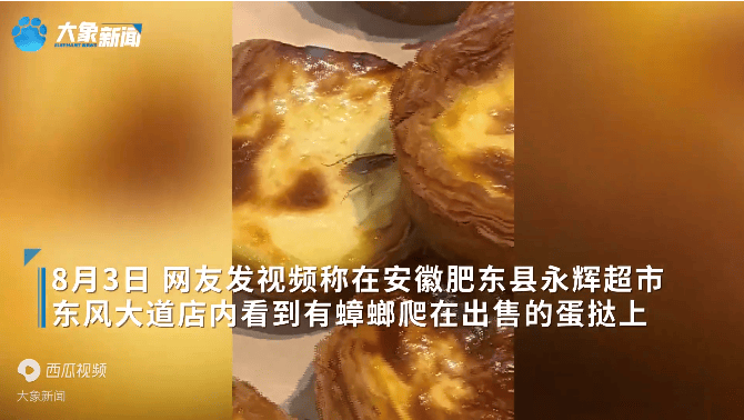 8月3日,有网友发视频称,在合肥市肥东县撮镇镇永辉超市(东风大道店)内蛋挞上看到了蟑螂在爬。后续商场工作人员回复称已经下架该排面所有商品并会在闭店后安排消杀。