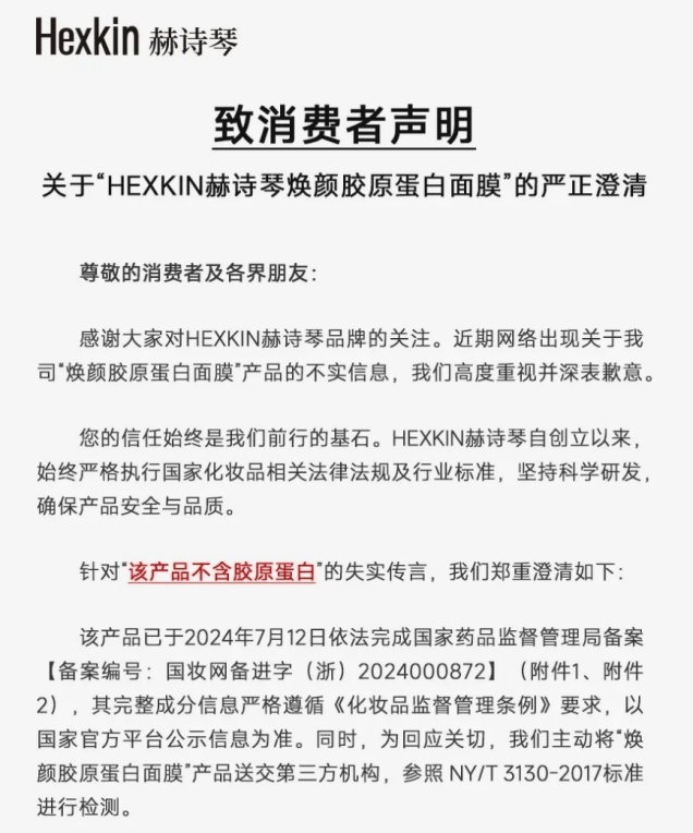 定位为中高端的护肤品牌的HEXKIN赫诗琴,其旗下核心产品“焕颜胶原蛋白面膜”被质疑不含胶原蛋白,引发了消费者的关注。