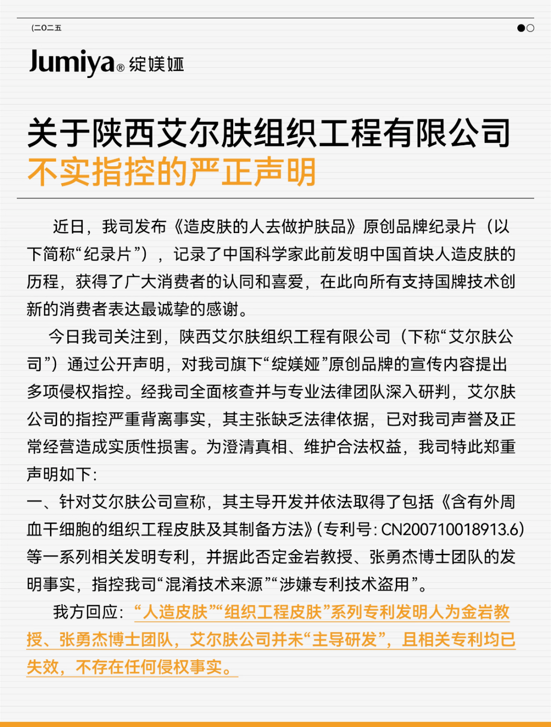 6月6日,绽媄娅发布声明,表示“人造皮肤”、“组织工程皮肤”系列专利发明人为金岩教授及张勇杰博士团队,艾尔肤未“主导研发”,且相关专利均已失效,不存在任何侵权事实。
