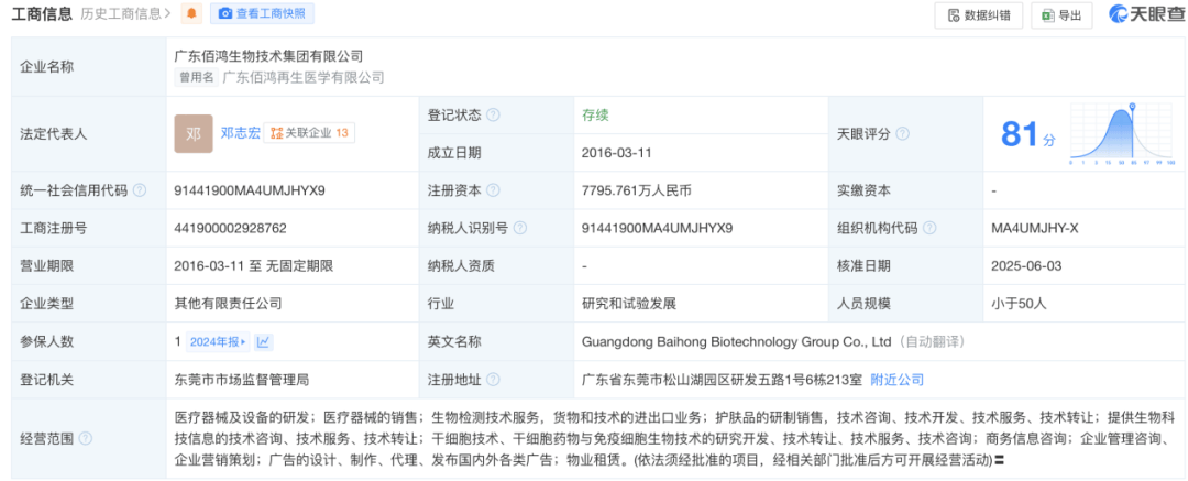 官网显示,佰鸿集团是一家专注于再生医学医疗、再生科技护肤技术与再生科技食品领域产学研销相结合的高科技集团化公司。