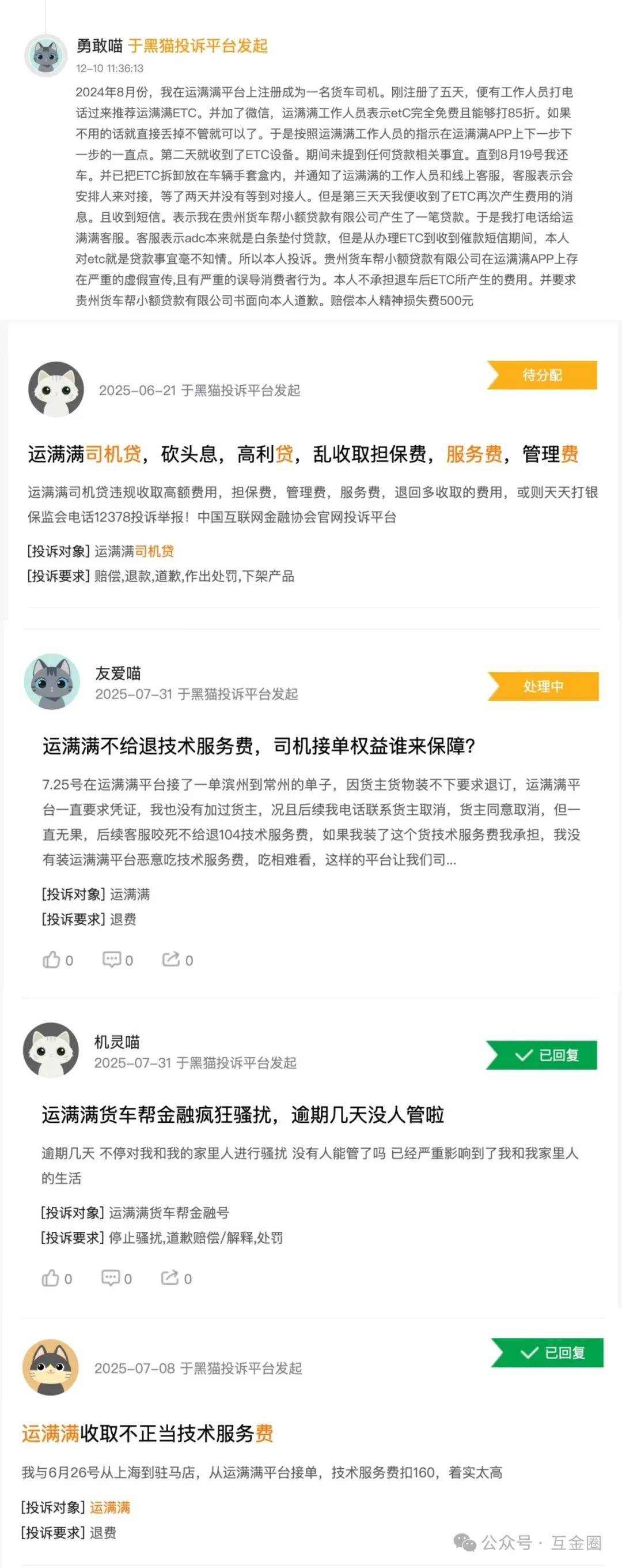 综合媒体报道与黑猫投诉显示,除利息外,“货车帮小贷”还向“司机贷”的借款人收取“平台服务费”,从而推高了综合贷款年化利率水平。在黑猫投诉上,有用户投诉显示运满满以免费办ETC为名,实为用户办理贷款。