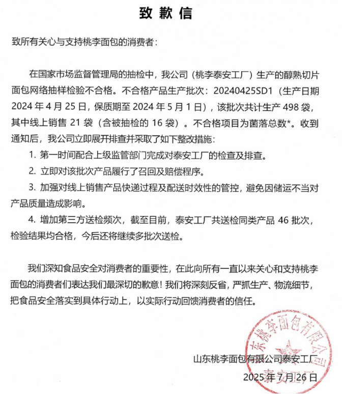这次事件曝光后,山东桃李面包有限公司泰安工厂发布致歉信,承认产品抽检不合格,并表示已采取一系列整改措施:第一时间配合监管部门完成检查及排查,对该批次产品履行召回及赔偿程序,加强线上销售产品快递过程及配送时效性管控,避免储运不当影响产品质量,增加第三方送检频次。