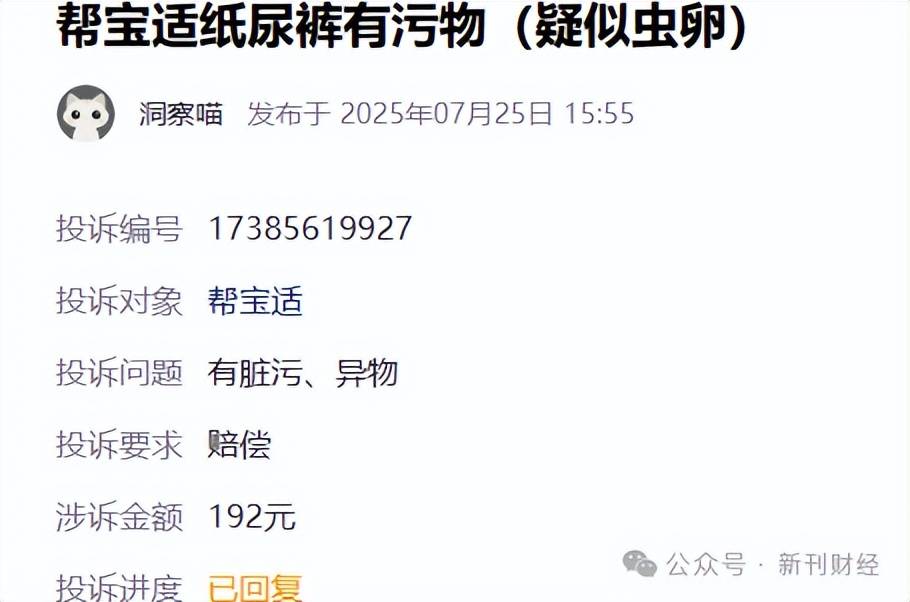 根据黑猫投诉平台最新披露,同样存在类似情况。7月25日有消费者反映,其于7月1日通过抖音平台购买的帮宝适“清新帮”纸尿裤组合装,在7月10日收货后,于7月24日晚间使用过程中发现其中一片纸尿裤后腰部位存在异常,出现一颗棕黑色、细长米粒大小的不明污染物,疑似虫卵。