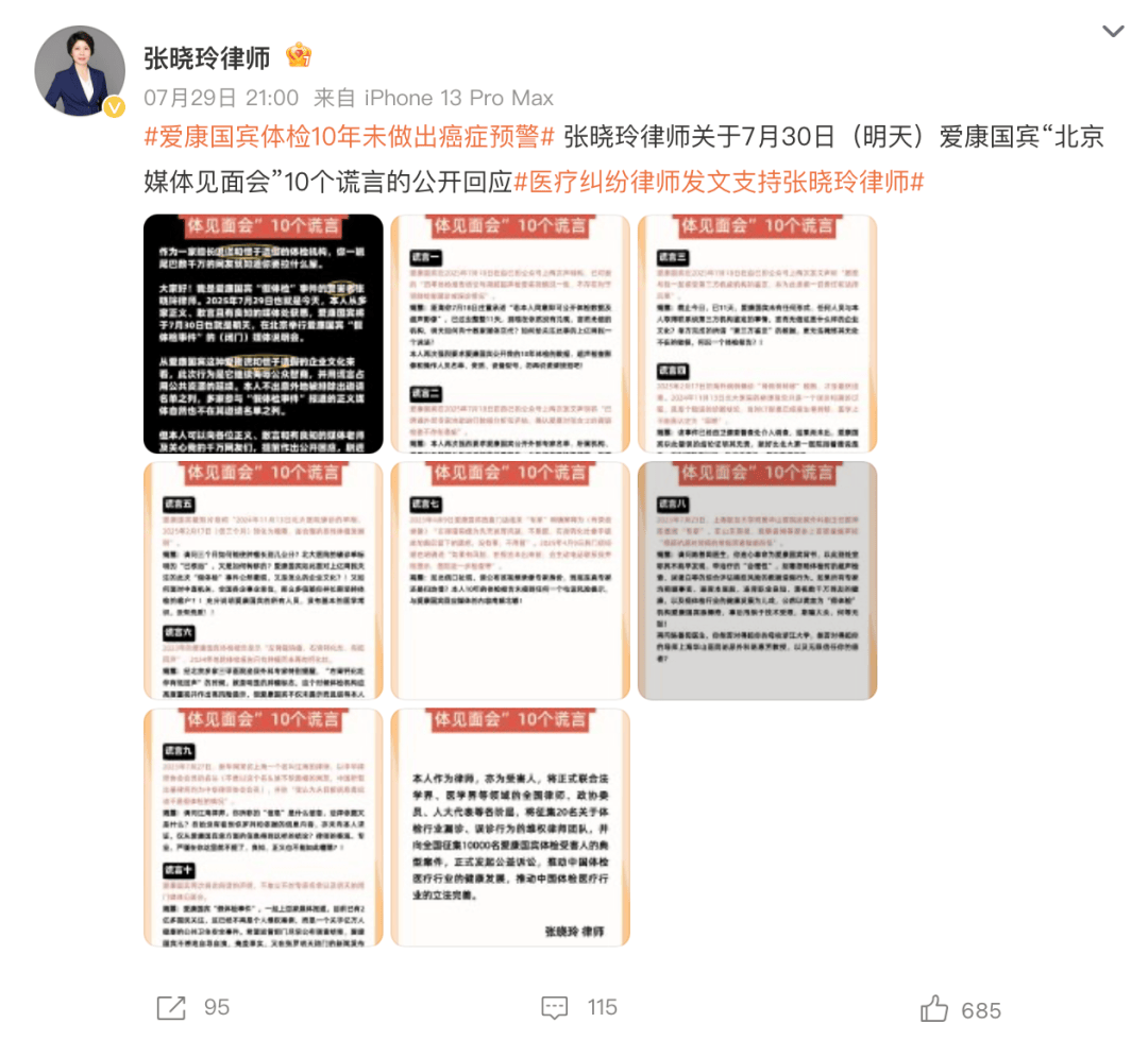 同日,爱康国宾账号又发布声明称,近日,张女士通过社交媒体散布“爱康国宾假体检”等不实信息,严重侵害公司合法权益。现基于医学事实与法律程序,爱康集团已就张女士虚构事实、散布谣言的侵权行为向法院正式提起诉讼,并获法院受理并立案。