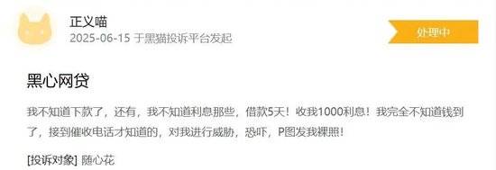 有网友表示,今年6月2日通过手机推送短信下载随心花软件,填写基本信息、工作信息、朋友家属联系方式后,在未经同意的情况下强制下款1785元,五天到期要还3500元,属于黑网贷,联系客服还一直不处理 ,还爆通讯录恐吓。