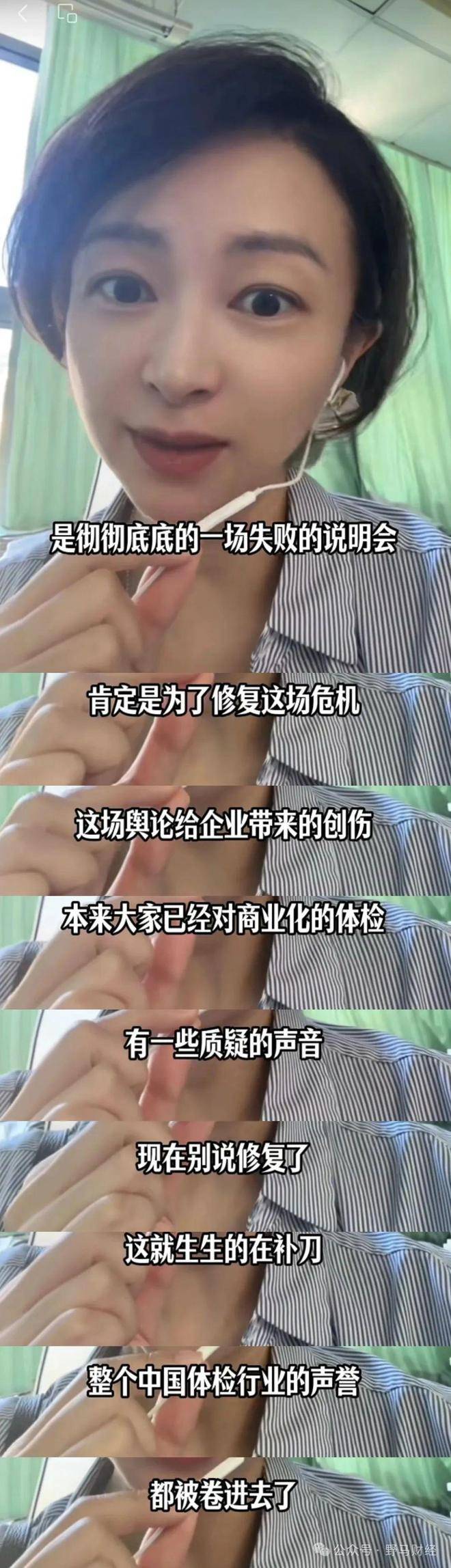 自媒体博主“我想静静了”认为,发布会的初衷肯定是为了修复这场危机,这场舆论给企业带来的创伤,本来大家已经对商业化的体检有一些质疑的声音,现在别说修复了,这就是生生的在补刀。整个中国体检行业的声誉,都被卷进去了。