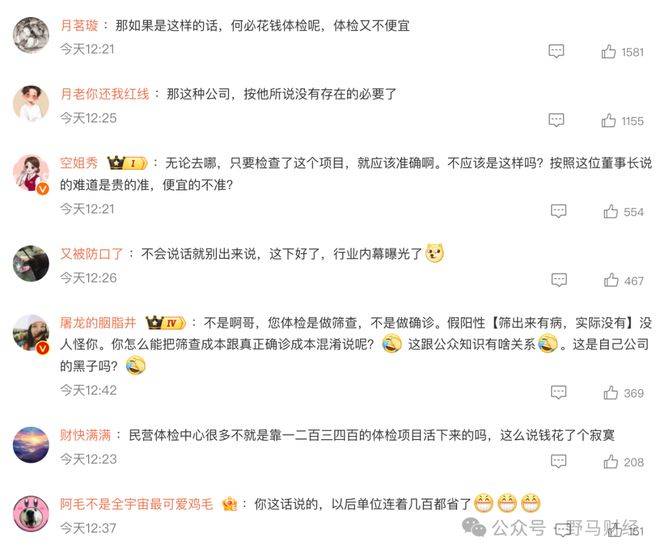 舆论一时哗然,有网友认为“那如果是这样的话,何必花钱体检呢,体检又不便宜。”“那这种公司,按他所说没有存在的必要了”。还有网友表示“无论去哪,只要检查了这个项目,就应该准确啊。不应该是这样吗?”“不会说话就别出来说,这下好了,行业内幕曝光了”“ 民营体检中心很多不就是靠一二百三四百的体检项目活下来的吗,这么说钱花了个寂寞”。