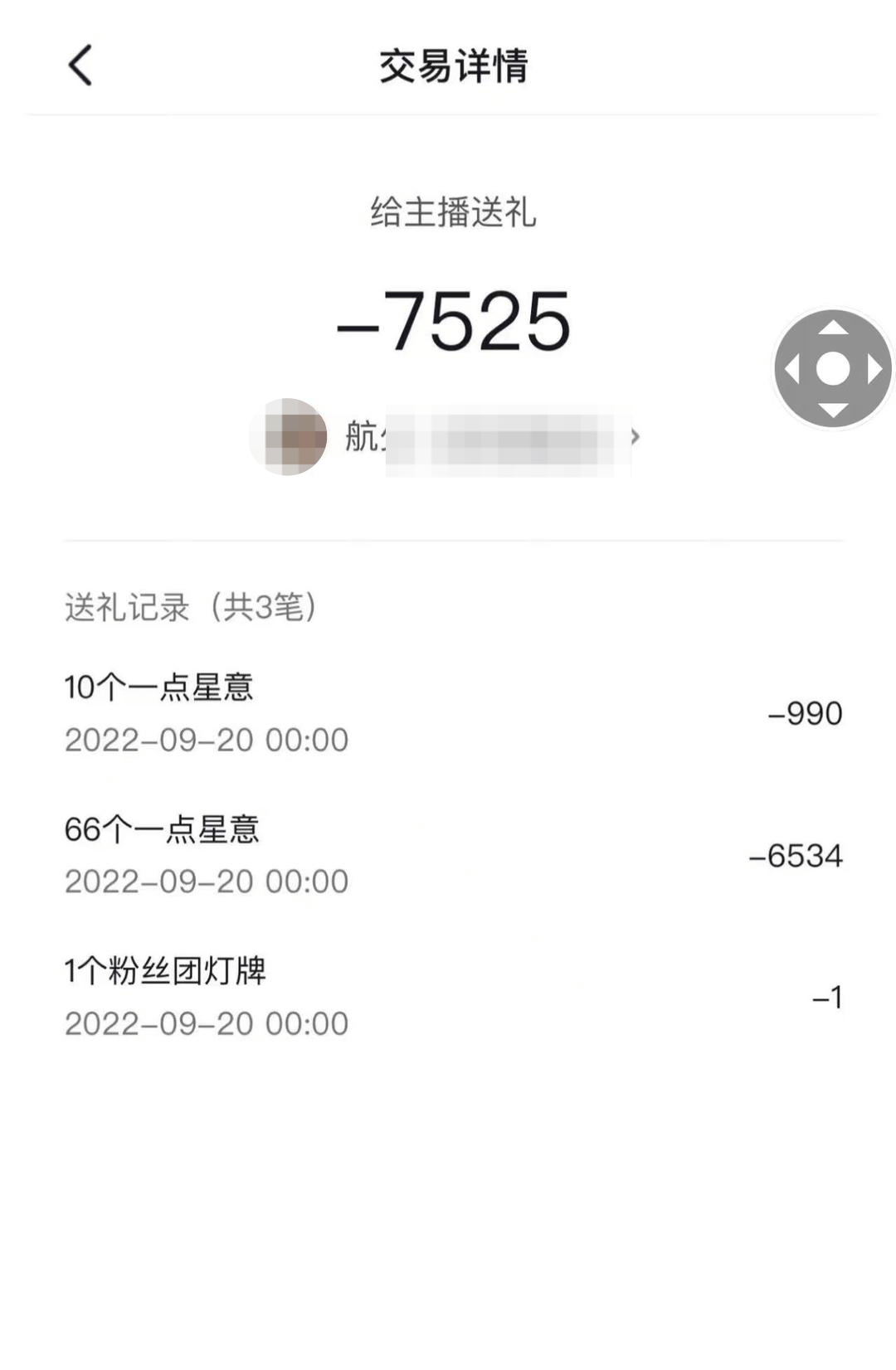 黄某提供的“交易详情”清单显示:2022年9月20日00:00时,黄某分三笔给主播“航某”送礼“7525”,9月23日00:01时至01:45时,黄某分9笔给主播“航某”送礼“2963”。
