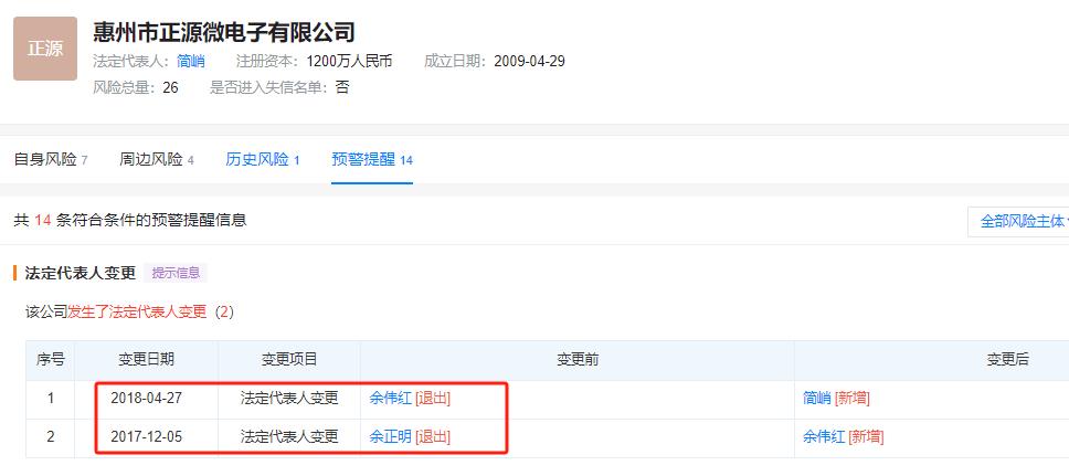 2017年12月,余正明卸任惠州市正源微法人代表及相关任职,转而交由余伟红负责。